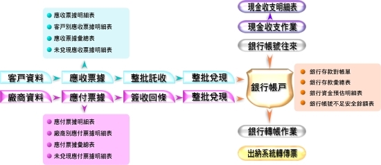 1.銀行存款日記帳 2.銀行存款對帳單 3.幣別帳號明細表 4.銀行存款彙總表 5.銀行資金預估明細表 6.銀行資金預估彙總表 7.銀行帳號不足安全餘額表