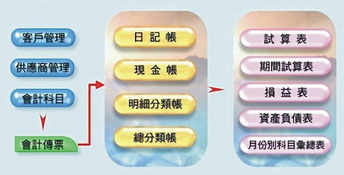 全國最聰穎的會計總帳財務包裝,內含客戶廠商資料管理及會計總帳,傳票輸入,所有表報即查即現,易學易懂,讓公司的財務狀況完全輕鬆掌握
