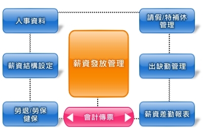 1.薪資發放維護 2.薪資發放轉出納傳票作業 3.勞退保健保資料異動維護